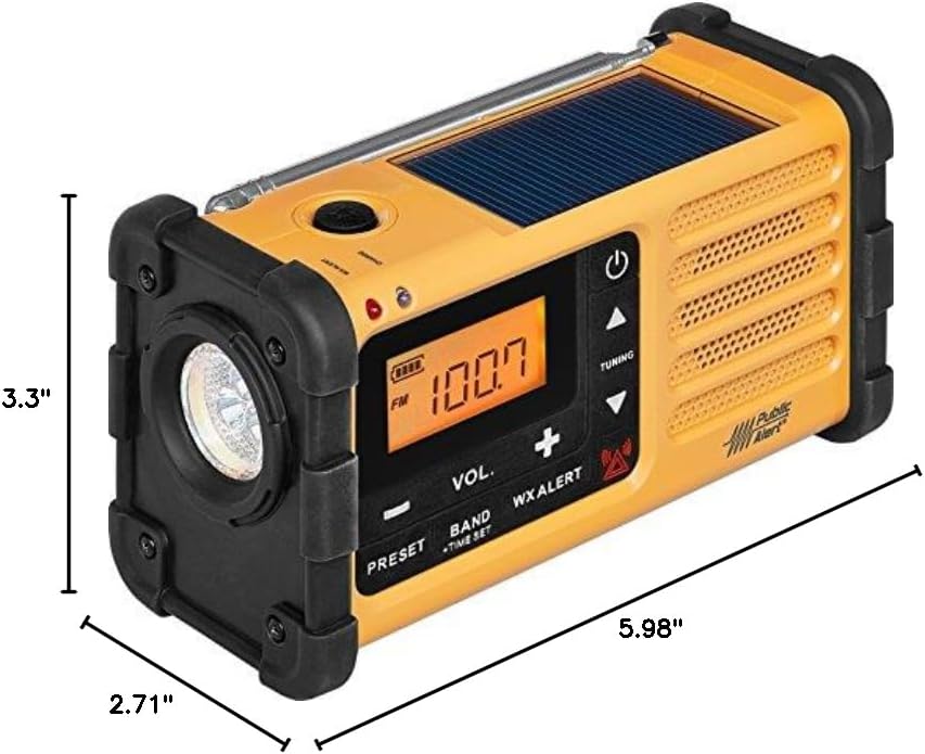 powered by handcrank dynamo/photo voltaic panel/dc enter. public alert-certified climate radio