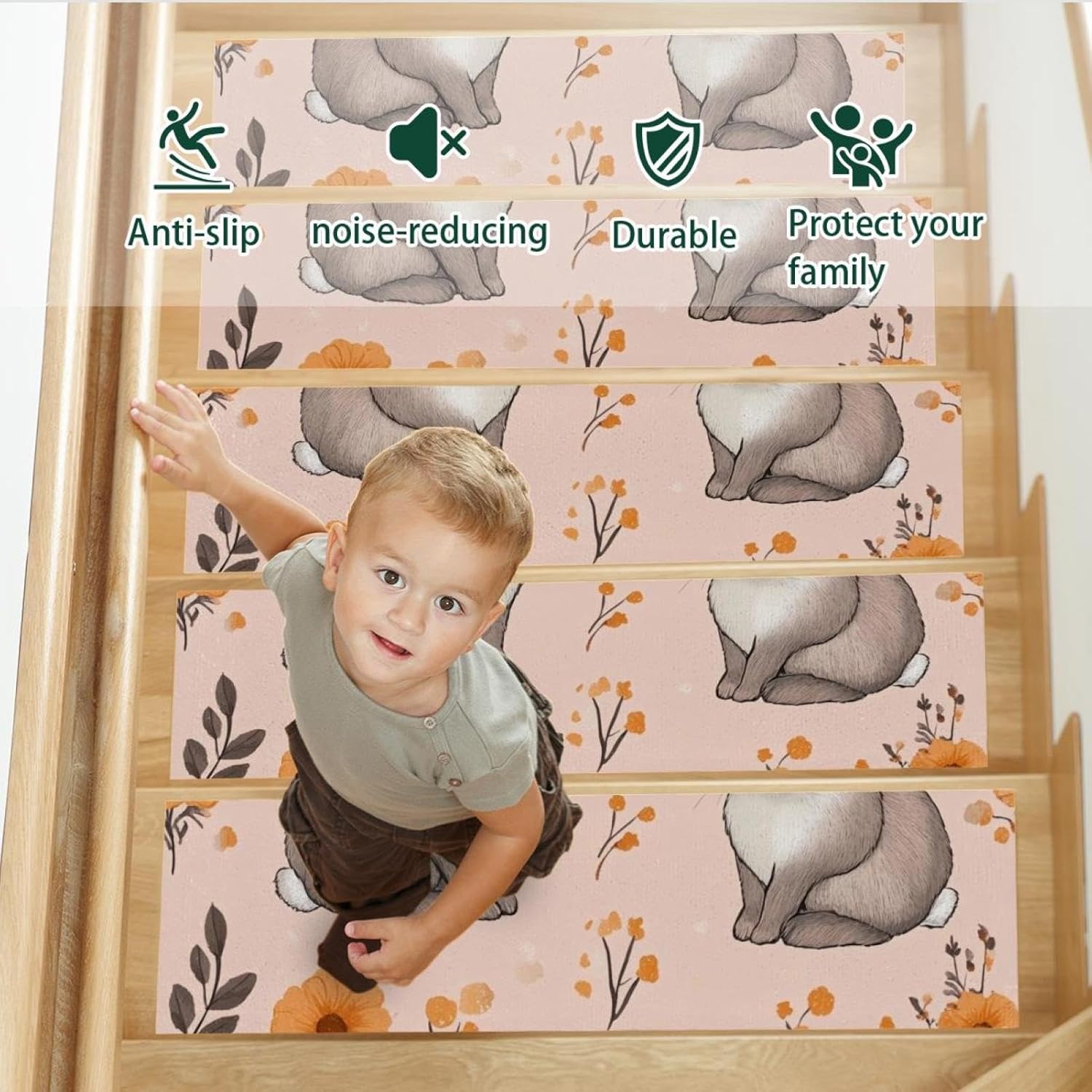 Materials: Our stair treads are designed with delicate and good materials,a self-adhesive backing, not straightforward to slide and guaranteeing your security. The polyester floor absorbs water, stopping stains on the ground. The TPE again is non-slip and water resistant, stopping injury to the steps. The step treads are constructed from 3 layers. These 3 layers completely complement one another, offering added stability.