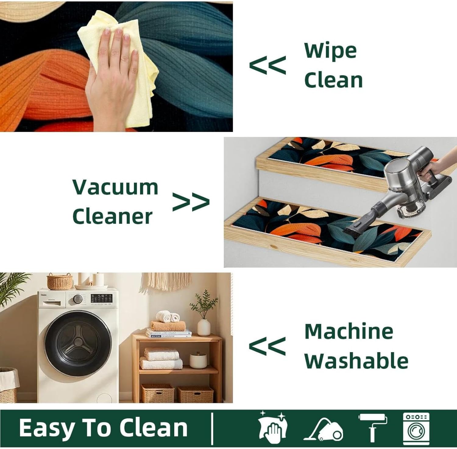 Simple to Clear: Vacuum, hand wash or machine wash. The stair runners for wood steps could be machine washed, ideally hand washed, or vacuumed. Don’t use bleach or tumble dry at excessive temperatures, drying at applicable low temperatures will provide you with a snug texture.