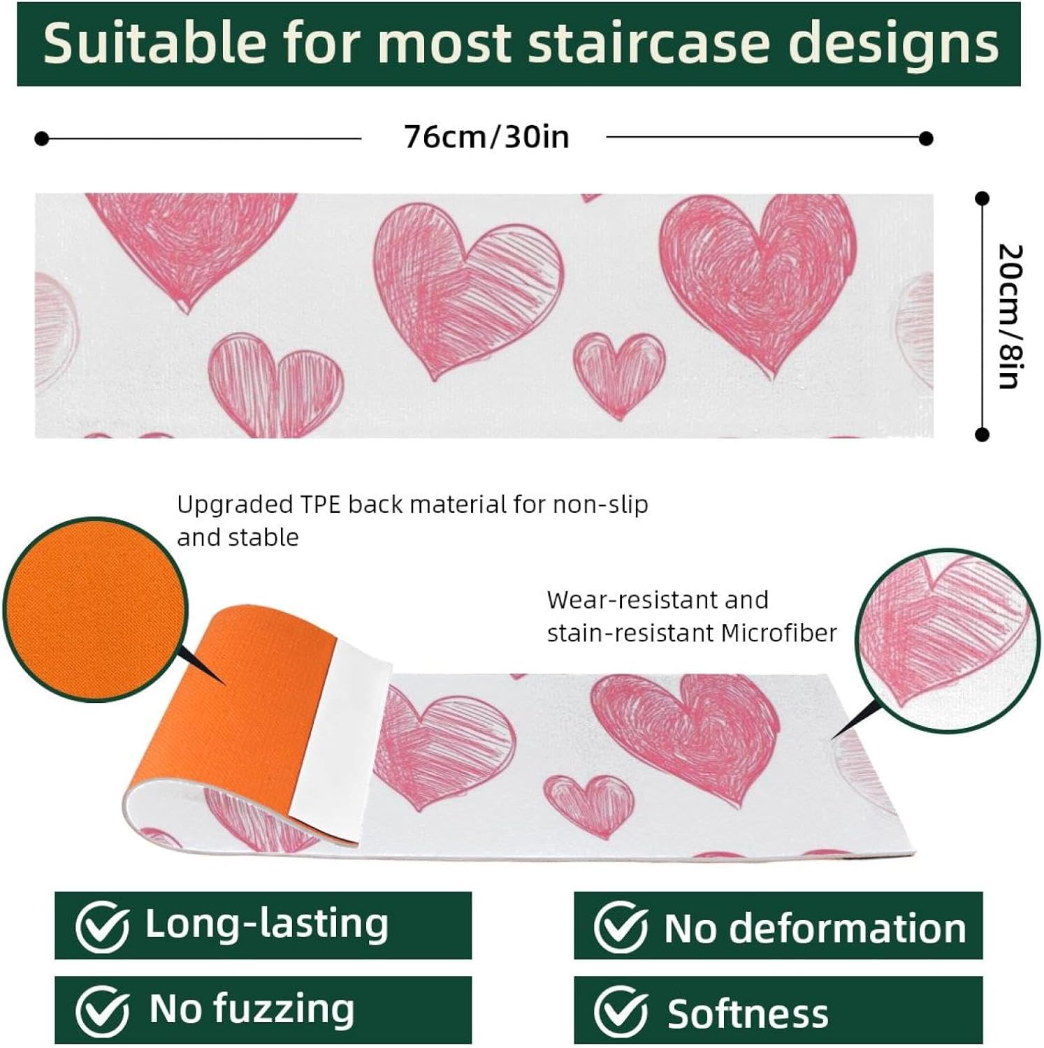 Measurement: Sturdy stair rug is 30 x 8 in / 76 x 20 cm, Stair treads thickness is 5 mm. Installs on the stair to guard the steps from injury. Defending the aged, kids, and pets from slips when going up and down the steps.