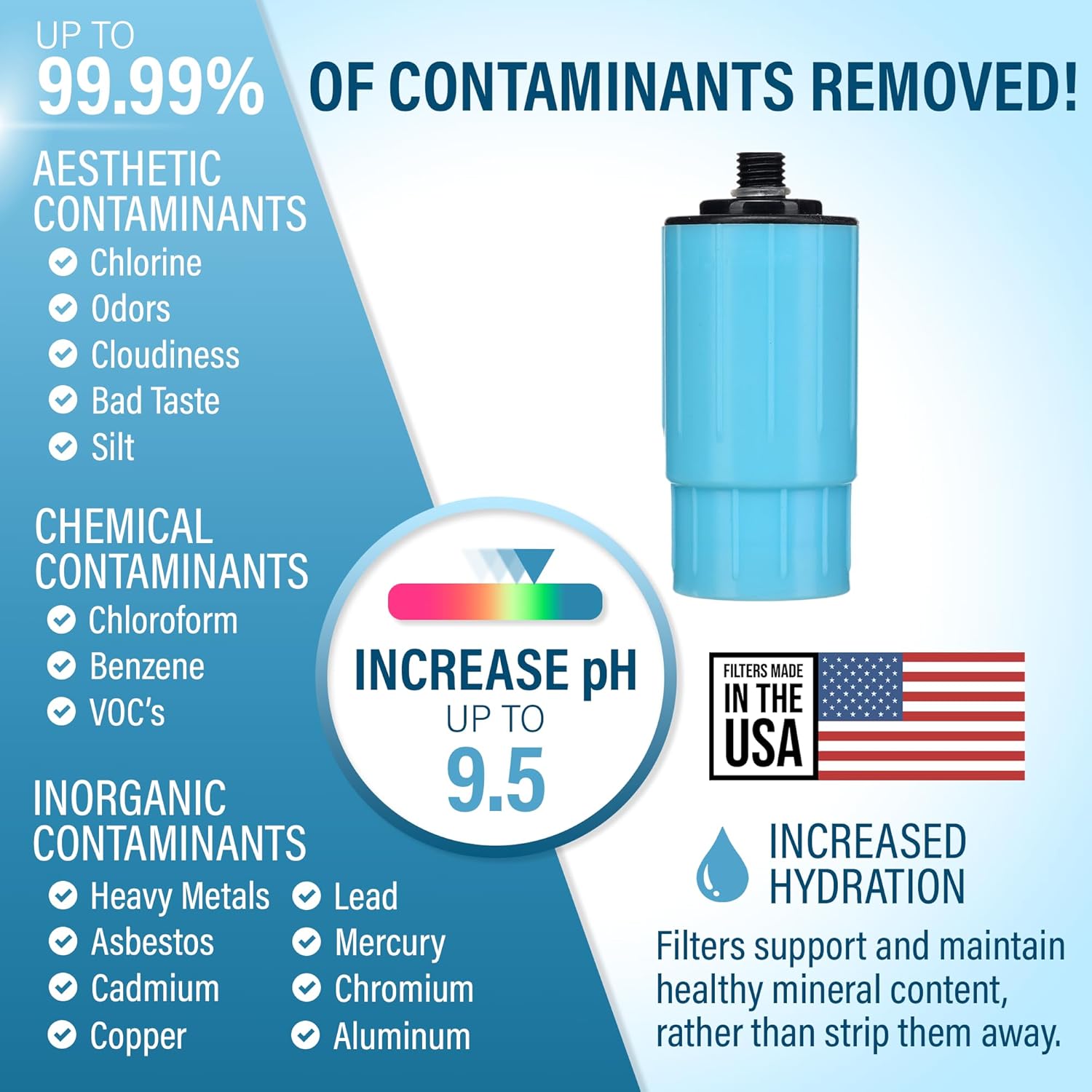 REMOVES UP TO 99.99% OF CONTAMINANTS – Chlorine, Chloramine, Lead, Mercury, MTBEs, and 50 VOC’s.
