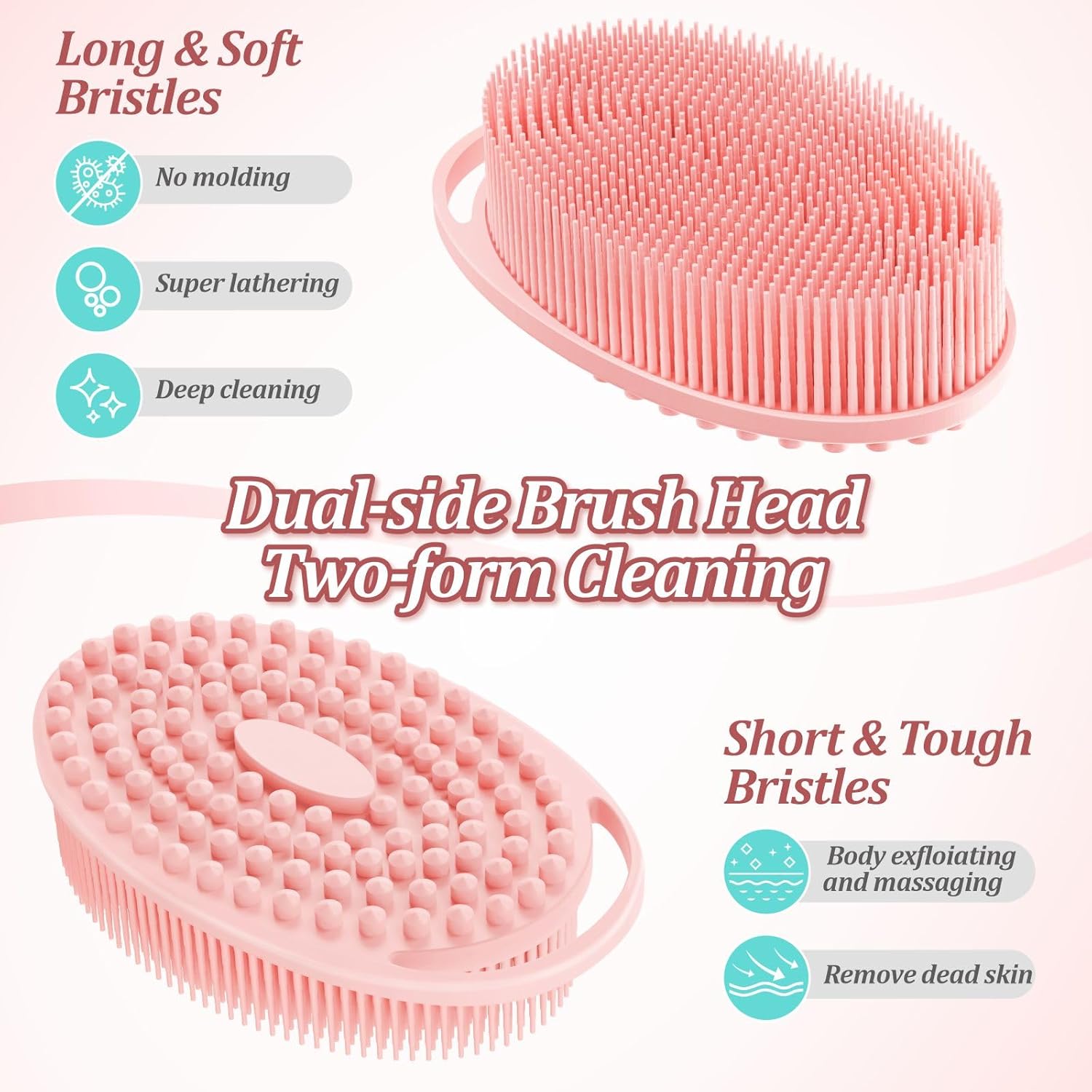 【SOFT BODY BRUSH – Twin-side Brushes, Two-type Utilization】Oval Bathtub Brush have two completely different sides to offer two completely different brushing experiences. One aspect with one Inch Lengthy bristles for fast lathering and straightforward physique cleansing; One has a aspect with quick and hard dots for exfoliating and massaging. Constructed-in giant hanging loop offers straightforward hanging to all types of hooks in you lavatory; Mild-weighted and palm-sized, the physique brush offers straightforward and non-slip gripping for each adults and youngsters.