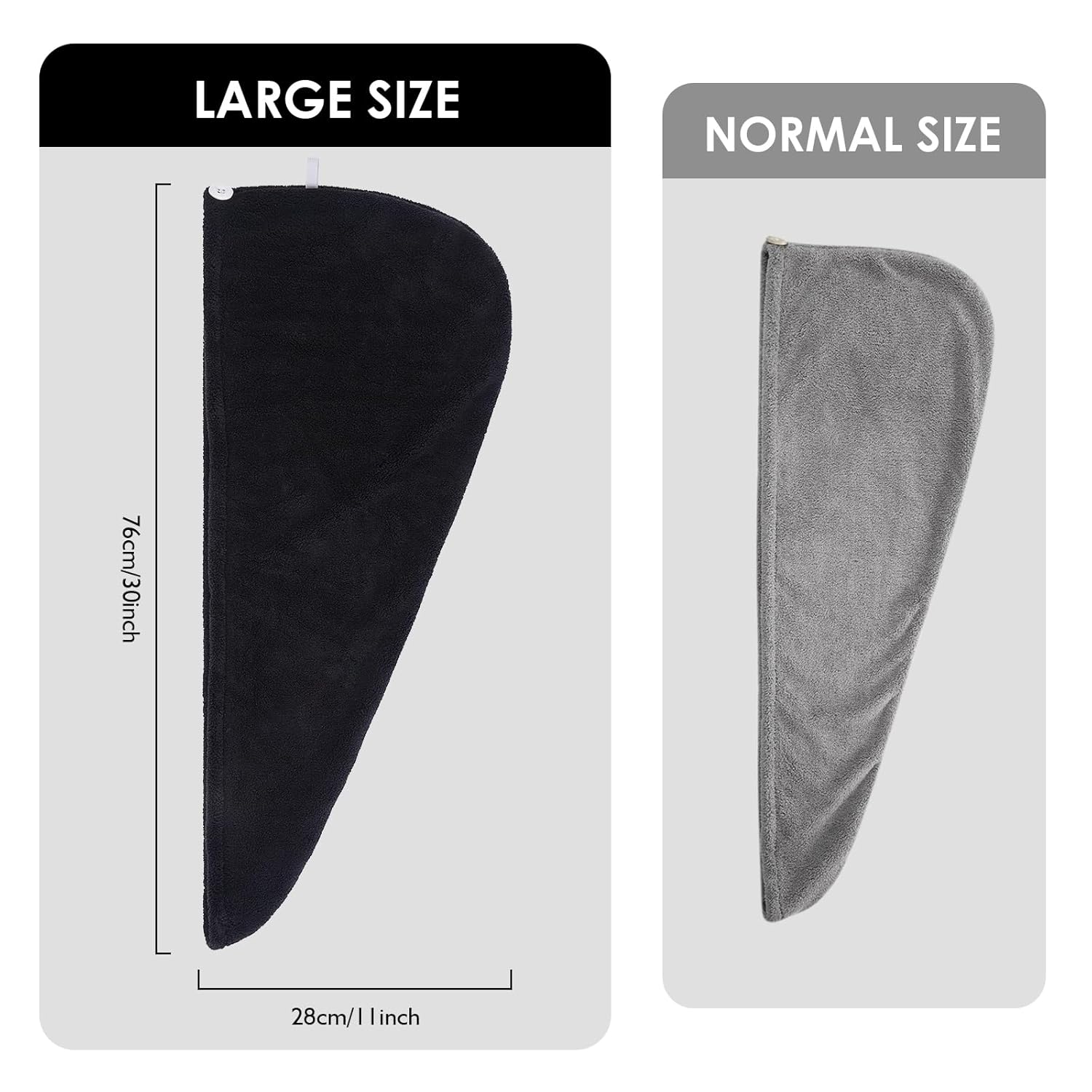 Massive hair drying caps: 30 inches X 11 inches/ 76 cm X 28 cm.Appropriate for every type of hair lengths.Kids, adults can use,Our anti-frizz towels make drying your hair after a bathe straightforward and easy