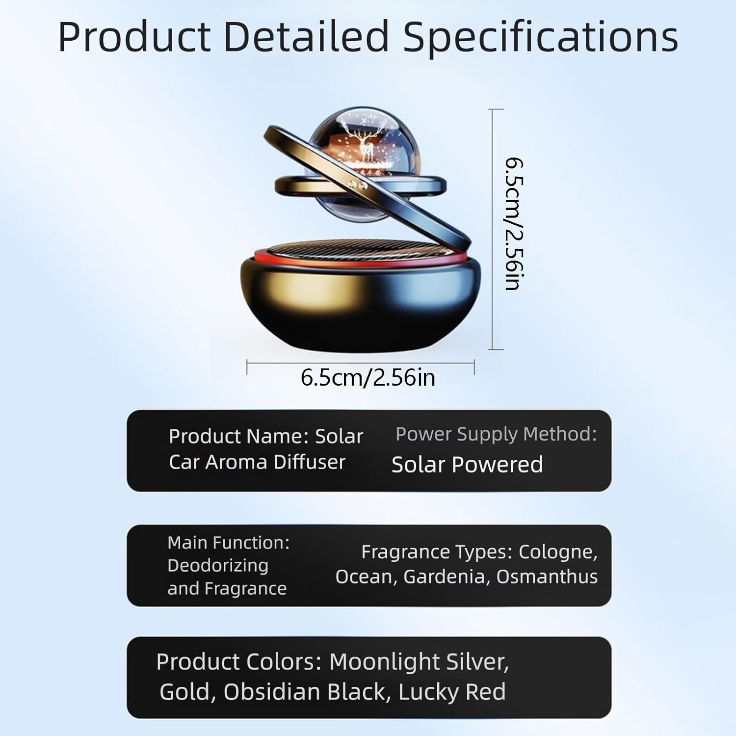 SOLAR POWERED: Crystal ball air freshener powered immediately by daylight, that includes auto-rotation performance when uncovered to direct daylight for a high-tech dashboard accent