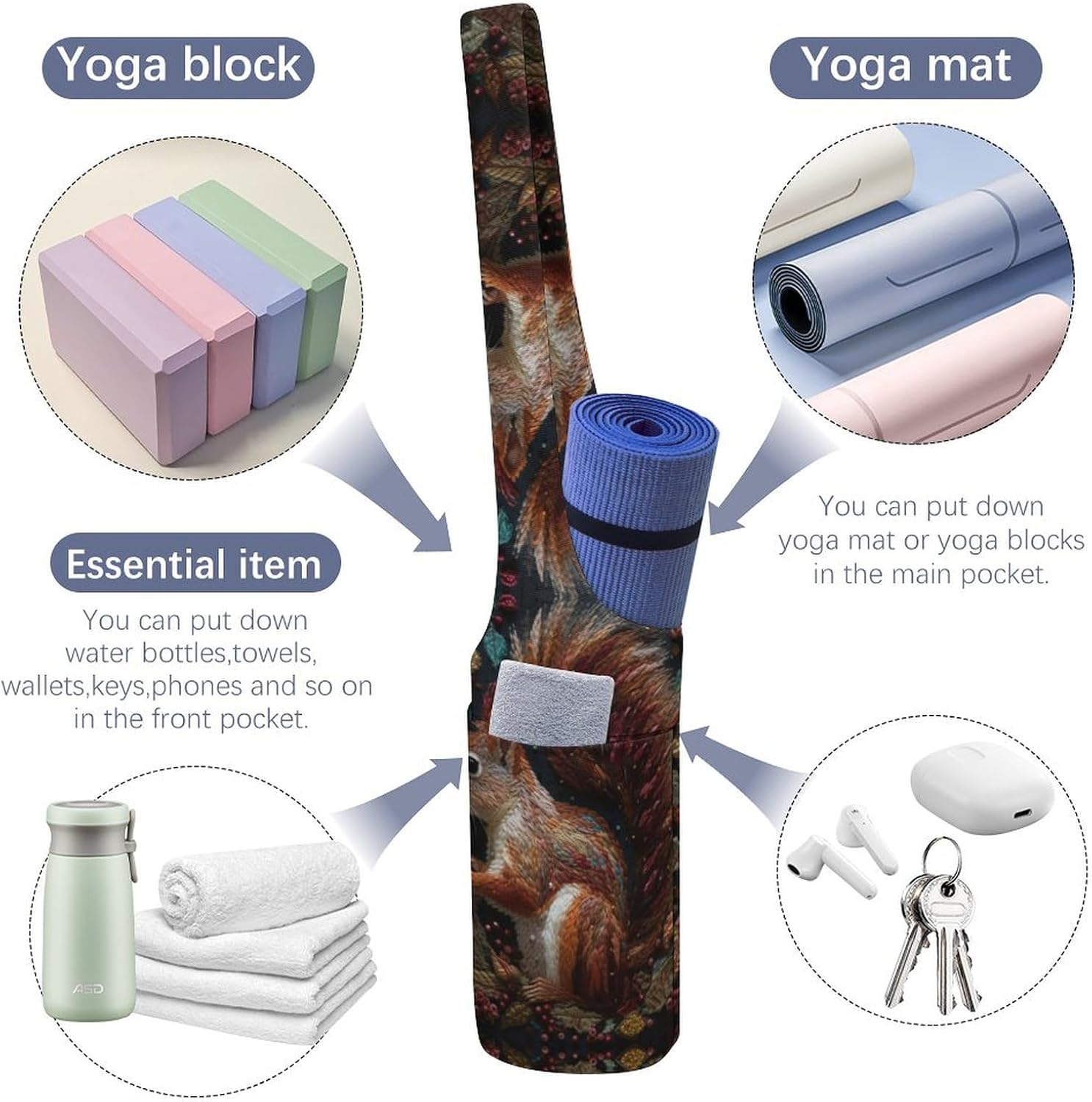 Greater And Higher: Yoga Mat Bag General Size 36.6 Inches, Width 7.1 Inches.The Squirrel Embroidery Yoga Tote Bag Suits Thicker And Wider Yoga Mat Simply. with Yogis Real Wants in Thoughts, This Yoga Bag Brings A lot Comfort into Every day Group And Storage of The Yoga Equipment, Multi-Useful And Sensible.