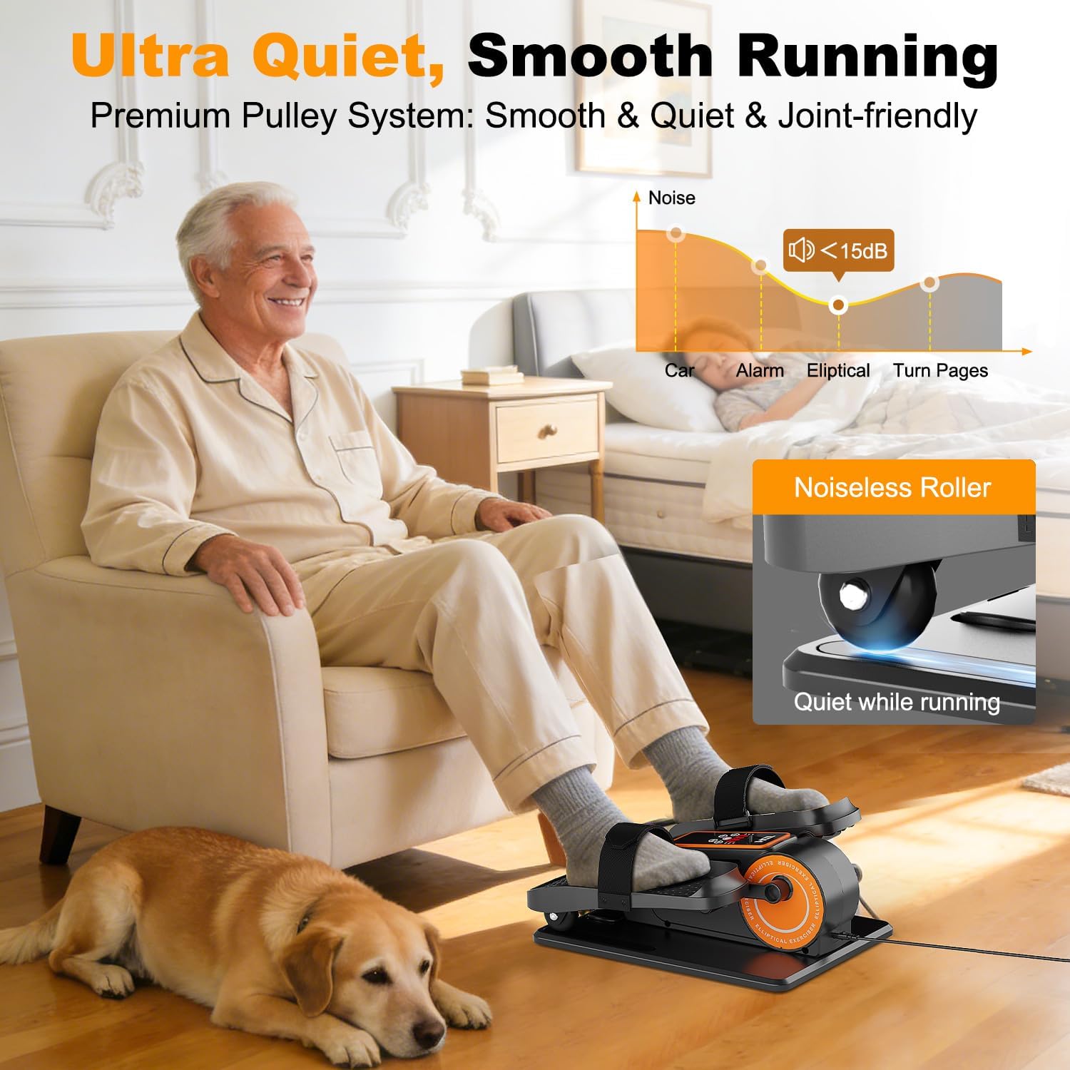 SPACE-SMART PERFORMANCE:This compact elliptical has silent wheels and superior sound insulation, decreasing noise to under 15 dB. Its low-resistance rollers and non-slip pads stop disturbing colleagues/household. Weighing simply 9 lbs with a compact measurement, it boasts nice portability, suits small/shared areas