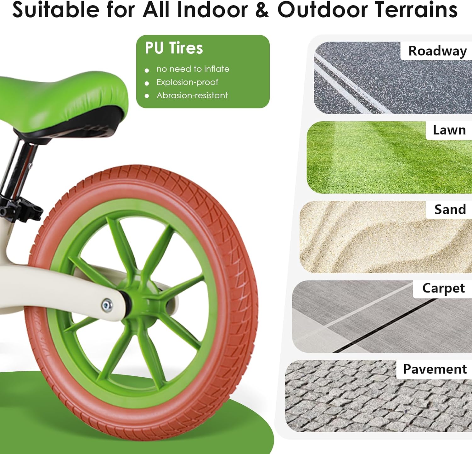 [USED INDOORS AND OUTDOORS] : This children steadiness bike is manufactured from silent and explosion-proof non-inflatable PU tyres, out there for all terrains and in a position to adapt to completely different surfaces. Whether or not indoors or outside, they not solely present a clean experience, however are additionally extra sturdy than the typical tyres available on the market, which may accompany youngsters for prolonged intervals and allow them to absolutely benefit from the enjoyable of using