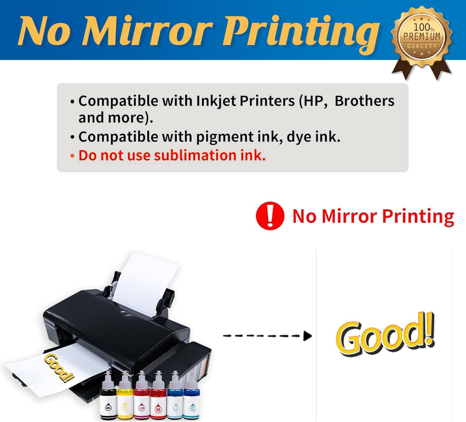 đź’•REQUIREMENTS: Inkjet Printers (comparable to HP, Brother and different manufacturers) | Pigment Ink or Dye Ink (Don’t use sublimation ink) | Scissors or Chopping Machine | Iron or Warmth Press machine | Teflon Paper (included within the pack).