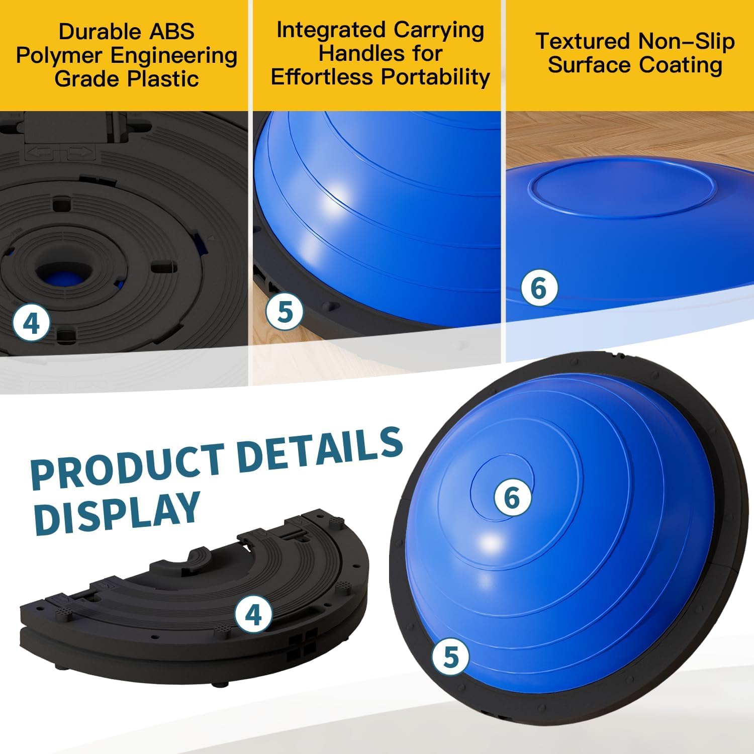 🧘♀️【𝐏𝐫𝐞𝐦𝐢𝐮𝐦 𝐃𝐞𝐬𝐢𝐠𝐧】This half ball stability coach encompasses a textured PVC floor + anti-slip TPR base + 6 non-skid ft for superior stability. 7mm thickened anti-burst design helps as much as 1300 lbs. Light-weight (8.7 lbs) and moveable with handles.