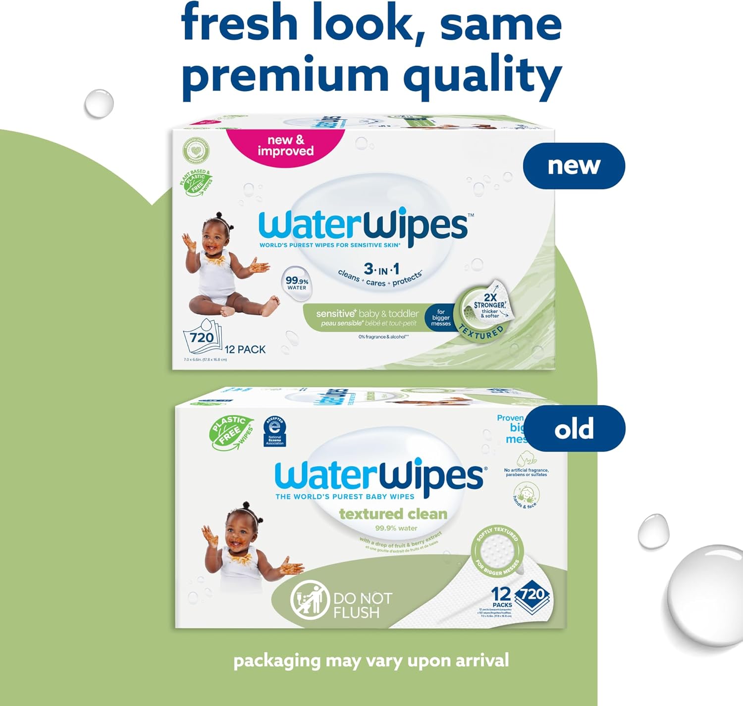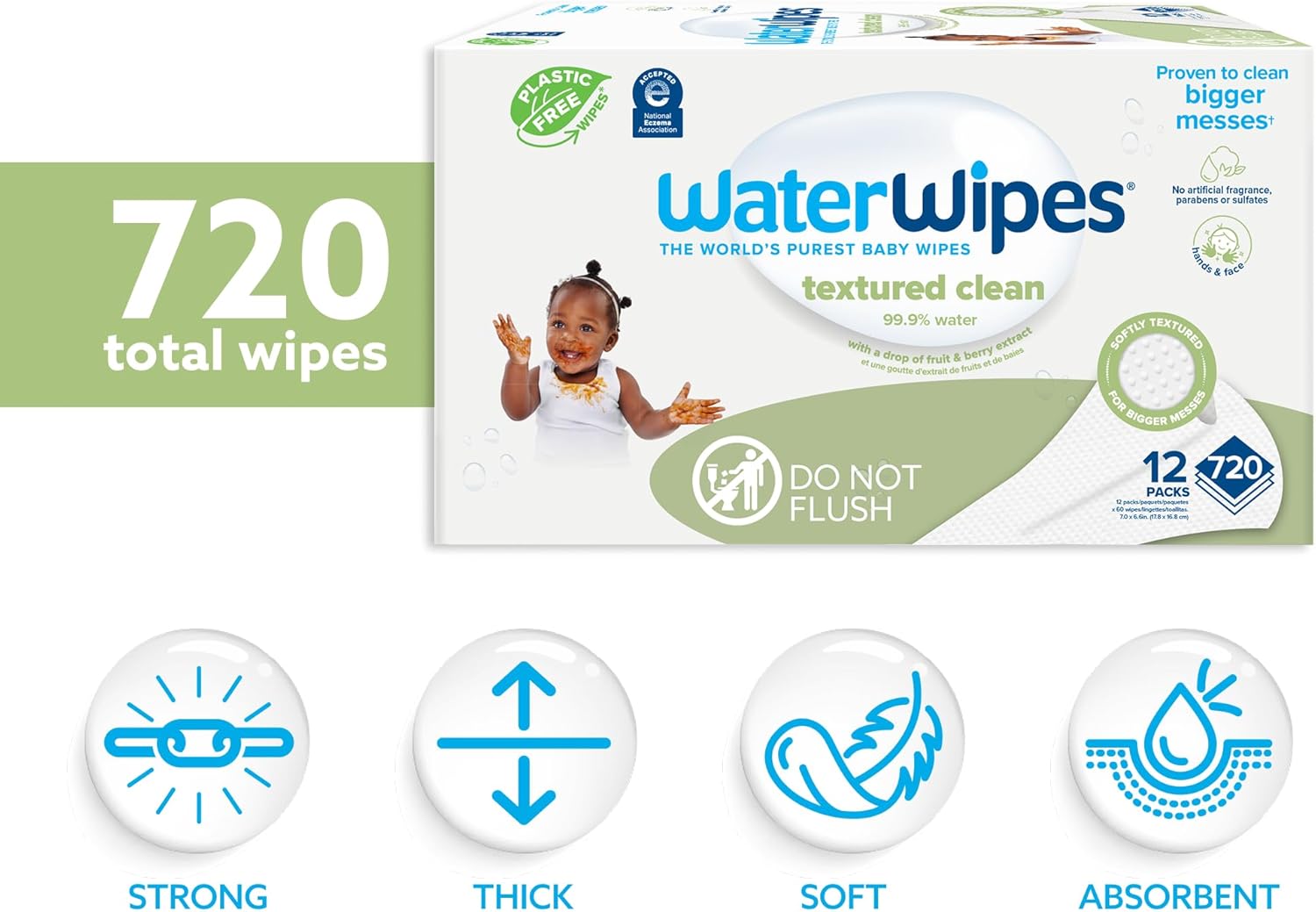 TEXTURED FOR TOUGHER MESSES: As infants develop, so do their messes. Now designed with a softer, enhanced texture, WaterWipes present added cleansing energy to sort out messes on palms, faces, and bottoms—excellent for rising infants and toddlers.
