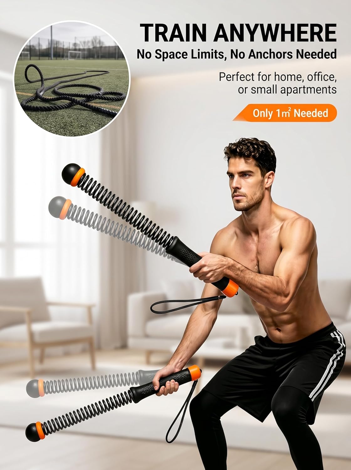 Moveable & Area-Saving Design: These cordless battle ropes require no set up, anchor or giant coaching space, making them good for house and journey use. The ropeless design eliminates loud slamming noises, permitting you to exercise quietly with out disturbing others. Merely choose them up and begin coaching each time and wherever you need.