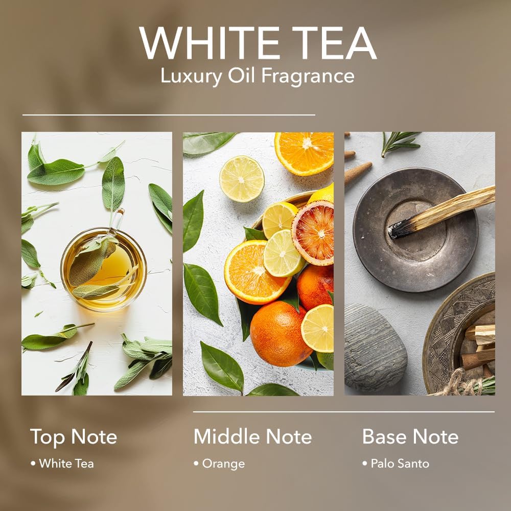 Pure Substances, Mix Of White Tea, Orange & Palo Santo: Made with pure aroma substances, this serene perfume opens with refreshing white tea and brilliant orange, balanced by the grounding heat of palo santo. A soothing scent designed to raise the ambiance of your private home, spa, or workplace.