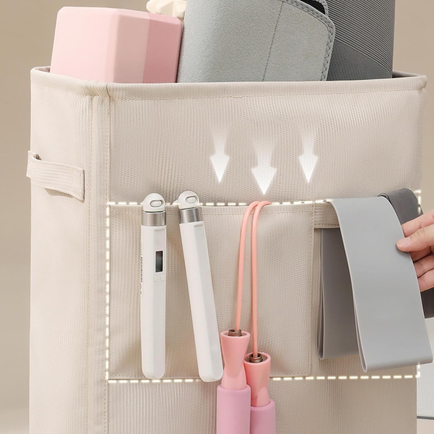 Hold your yoga area clear and arranged with this Oxford material yoga mat organizer rack Designed to suit neatly into corners it incorporates a spacious foremost compartment and a helpful aspect pocket for storing mats towels water bottles and extra Comprised of sturdy washable material this transportable rack is light-weight but sturdy sufficient to carry your every day exercise gear Its smooth impartial design blends superbly with any residence health club or room decor making it a sensible and trendy storage answer