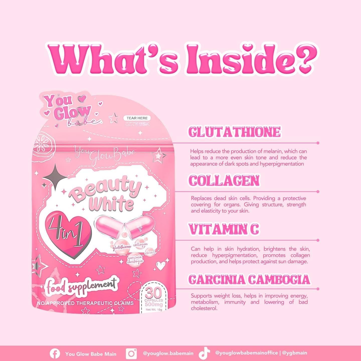 – Helps stop pores and skin ageing Magnificence White 4in1 Glutathione Capsules Lively Components: Glutathione (Free Type), Hydrolyzed Collagen (Bovine), Vitamin C (Sodium Ascorbate), Garcinia Cambogia (Carela Gummi Gutta), Alpha Lipoic Acid, Vitamin E (Alpha Tocopherol). Grape Seed Extract, N-Acetyl-L-Cysteine 500mg OTHER INGREDIENTS: Magnesium Stearate (Vegetable Supply). Expertise the transformative energy of You Glow Babe BEAUTY WHITE Glutathione Capsules and unlock the key to radiant, flawless pores and skin. *No accredited therapeutic claims.* ***At all times seek the advice of your physician earlier than beginning a brand new eating regimen or dietary dietary supplements. You Glow Babe Magnificence White Cleaning soap with Sea Buckthorn and Snail Extract, 5 Bars x 70g Unlock the key to radiant, luminous pores and skin with You Glow Babe’s Magnificence White Cleaning soap! 🩷 Infused with the outstanding advantages of Sea Buckthorn and Snail Extract, this luxury cleaning soap is your go-to resolution for remodeling uninteresting pores and skin right into a vibrant, wholesome glow. Why You’ll Love It: ✨: Formulated to fight dullness and improve your pure radiance. ✨ Hydration & Rejuvenation: Enriched with Snail Filtrate, Sea Buckthorn, and Niacinamide that work collectively to hydrate and rejuvenate your pores and skin, leaving it tender and supple. ✨ Glow On the Go: Good for every day use, this cleaning soap bubbles as much as reveal a refreshing cleanse that promotes a luminous complexion. Say goodbye to lackluster pores and skin and hiya to a vibrant, glowing you! 🛀🫧 Expertise the magic of You Glow Babe’s Magnificence White Cleaning soap and prepare to shine brighter than ever! ✨🌟 Components Cocos Nucifera (Coconut) Oil, Aqua, Sodium Hydroxide, Perfume, Lactic Acid, Salicylic Acid, Nia- cinamide, Clycerin, Hydrolyzed Collagen, Snail Secretion Filtrate, Butylene Glycol, Niacinamide, Alpha Arbutin, Sodium Metabisulfite, Tranexamic Acid, Sodium Citrate, Citric Acid, Aminopropyl Ascorbyl Phosphate, Geranium Robertianum Extract, Paeonia Suffruticosa Root Extract, Seutel- Maria Baicalensis Root Extract, Thymus Serpyllum Extract, Alpinia Katsumadal Seed Extract, Glutathione, Hippophae rhamnoides tea buckthorn) Extract, CI 45430/FD&C Pink #3.